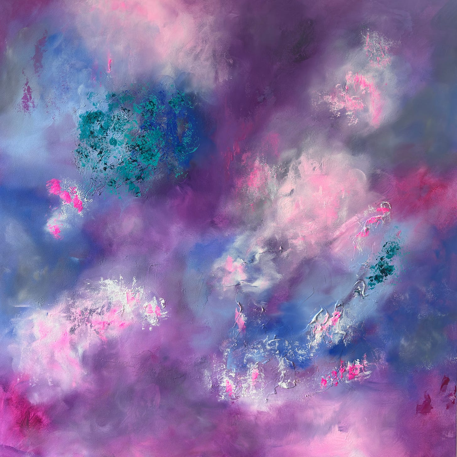 Stepping up to the canvas, my hands reaching for the bottles of colour and tipping them onto the palette. Squeezing the tubes with just amount of pressure that the carpet doesn’t take a hit. Taking the brushes and feeling the bristles for the most raggedy one and making the first marks. Smearing the the glossy texture with my fingertips, pulling the paint across the white spaces.